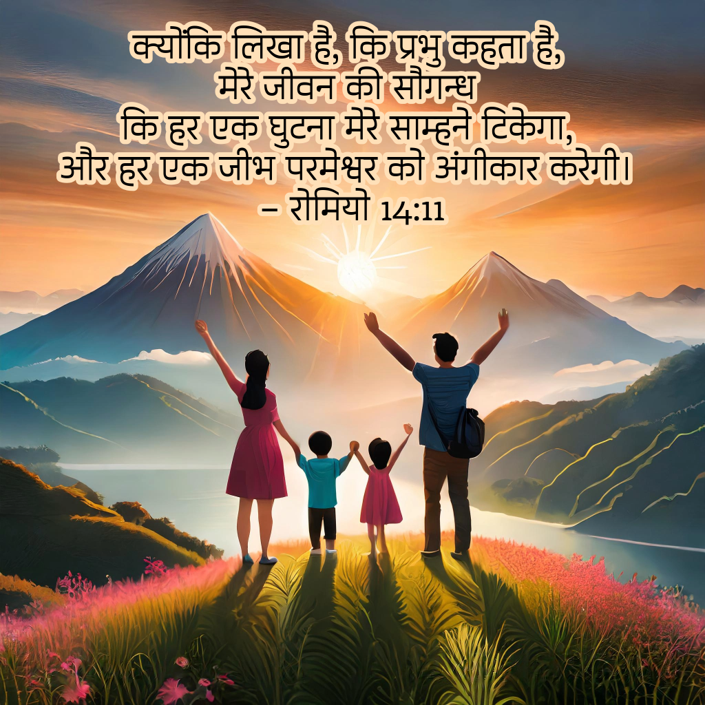 क्योंकि लिखा है, कि प्रभु कहता है, मेरे जीवन की सौगन्ध कि हर एक घुटना मेरे साम्हने टिकेगा, और हर एक जीभ परमेश्वर को अंगीकार करेगी। – रोमियो 14:11